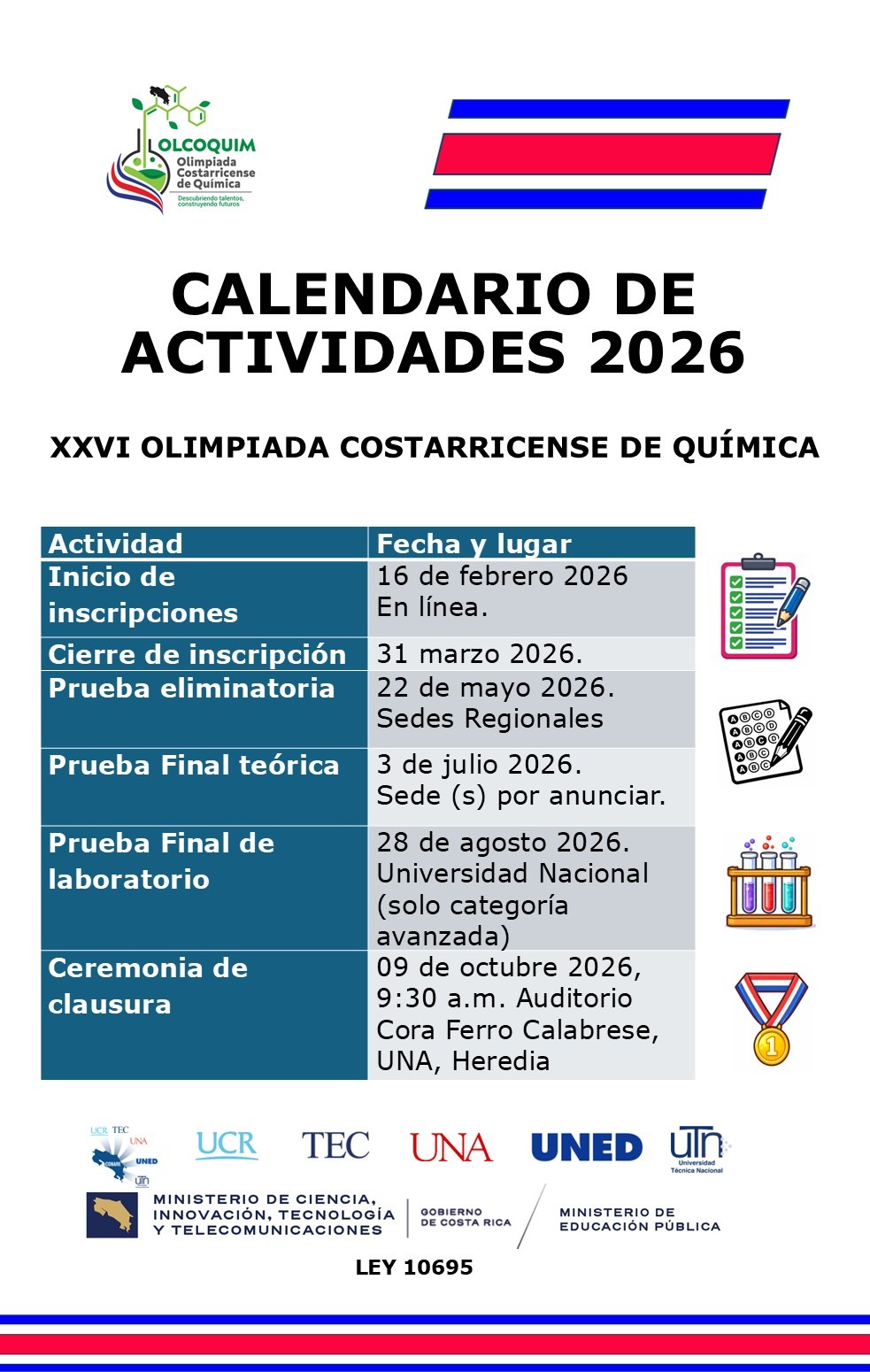 Categorías de competencia: Para efectos de organización, los participantes en la Olimpiada Costarricense de Química deberán escoger una de las tres categorías (según el cumplimiento de requisitos), a saber:
